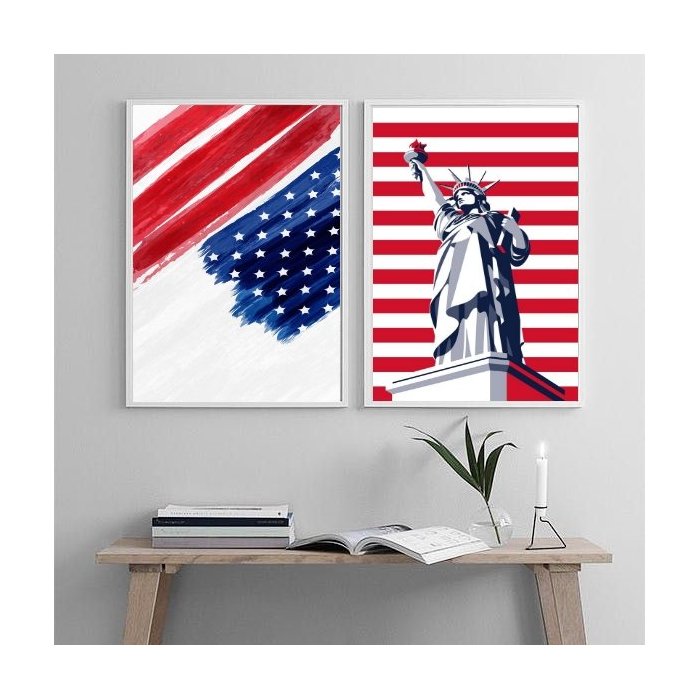 Kit 2 Quadros Eua - Bandeira e Estátua Liberdade 33x24cm - com Vidro:madeira Branca