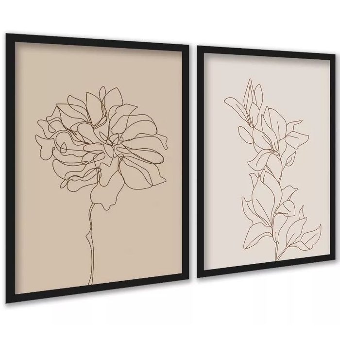Kit 2 Quadros Flores Linhas Suaves - Bege 24x18cm:moldura Branca