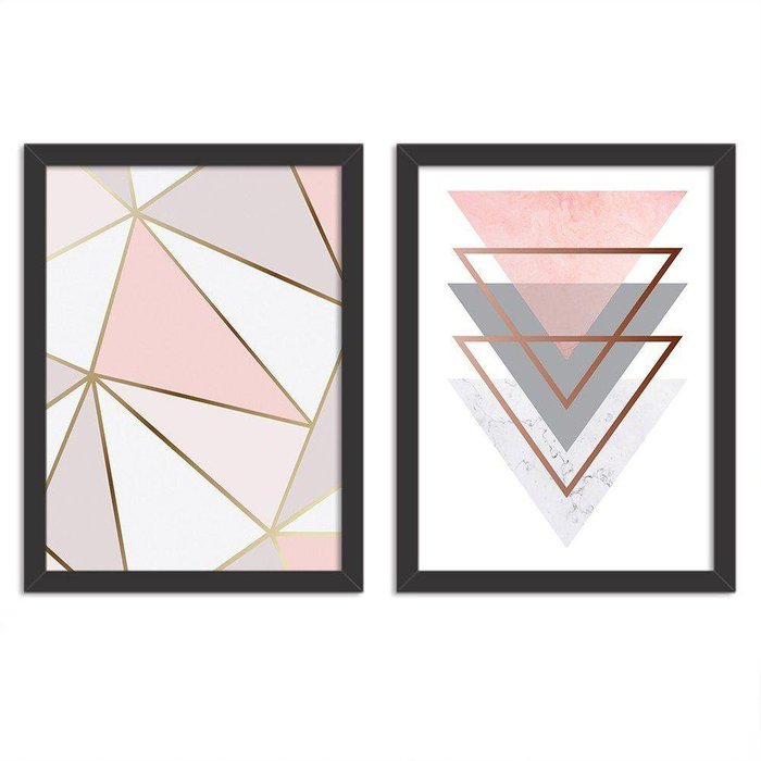 Kit 2 Quadros Decorativos Geométricos Rosa e Gold Preto - Grande -