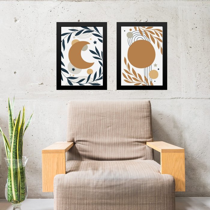 Kit 2 Quadros Gravuras Luas Boho 24x18cm:moldura Preta