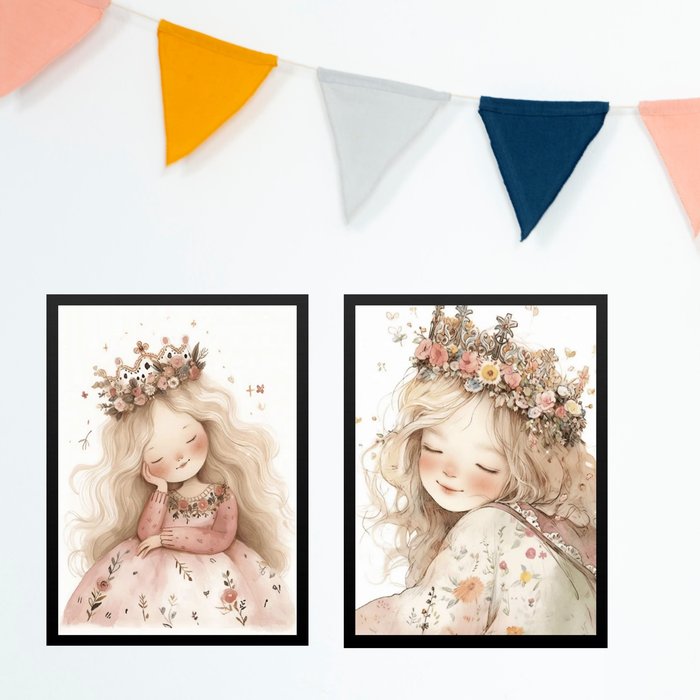 Kit 2 Quadros Infantis Menina Princesa 24x18cm - com Vidro:moldura Preta