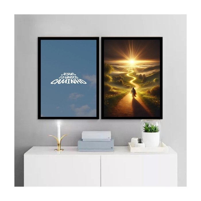 Kit 2 Quadros Jesus É o Caminho 45x34cm - com Vidro:moldura Branca
