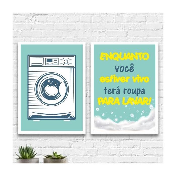 Kit 2 Quadros Lavanderia Azul e Amarelo 33x24cm