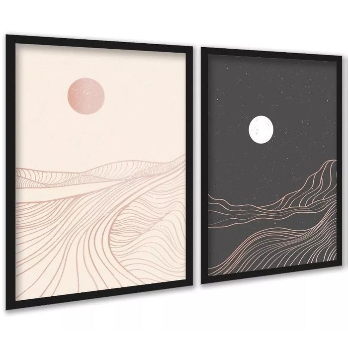 Kit 2 Quadros Montanhas Rosa Cinza Abstrato 24x18cm:moldura Branca Moldura branca