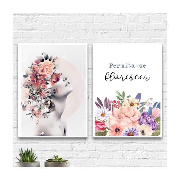 Kit 2 Quadros Mulher Permita-se Florescer 45x34cm - com vidro:Madeira preta preta