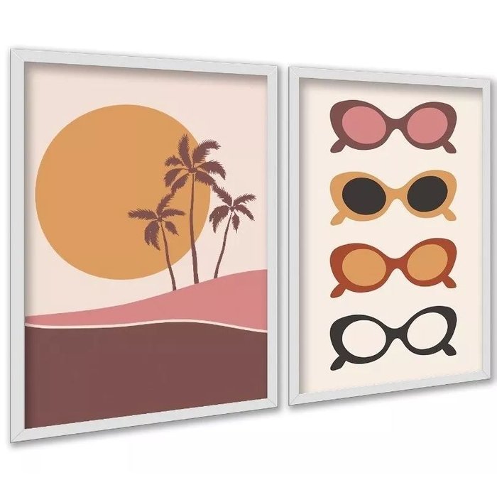 Kit 2 Quadros Óculos de Sol - Praia 24x18cm:moldura Branca