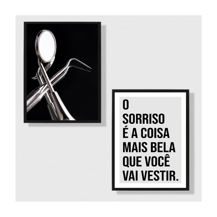 Kit 2 Quadros Para Consultório Odontológico 33x24cm - com vidro:Madeira preta