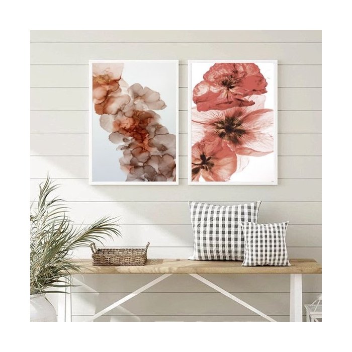 Kit 2 Quadros para Sala Flores Vinho e Marrom 45x34cm - com Vidro:madeira Branca