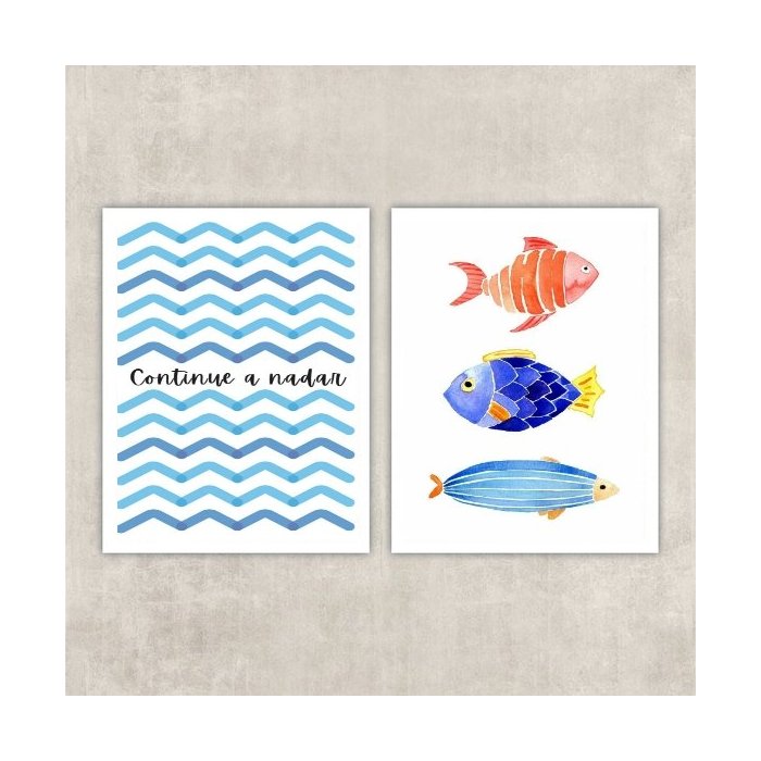 Kit 2 Quadros Peixes Continue A Nadar 24x18cm:Madeira branca