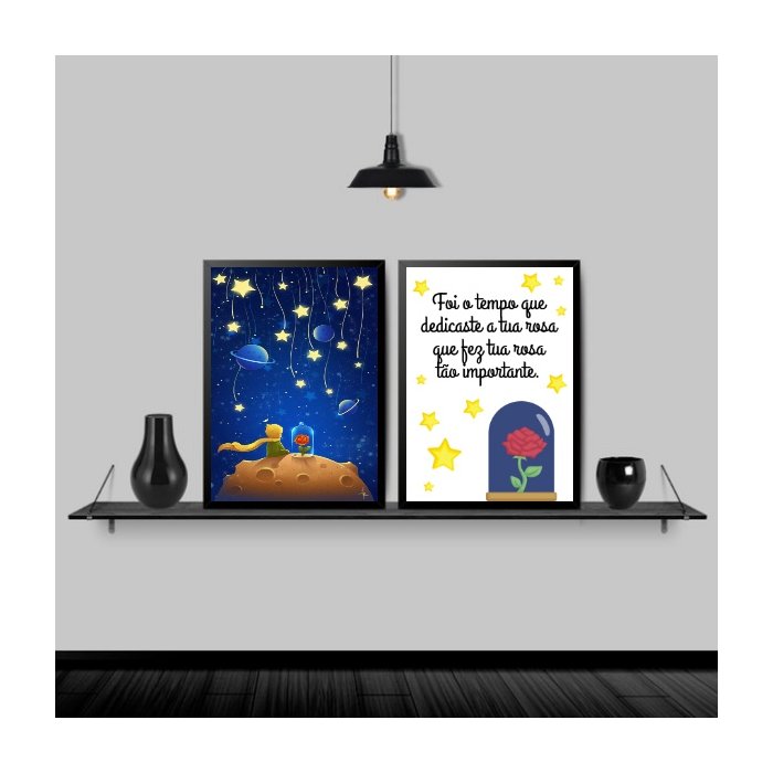 Kit 2 Quadros Pequeno Príncipe Frase 33x24cm - com vidro:Madeira preta preta