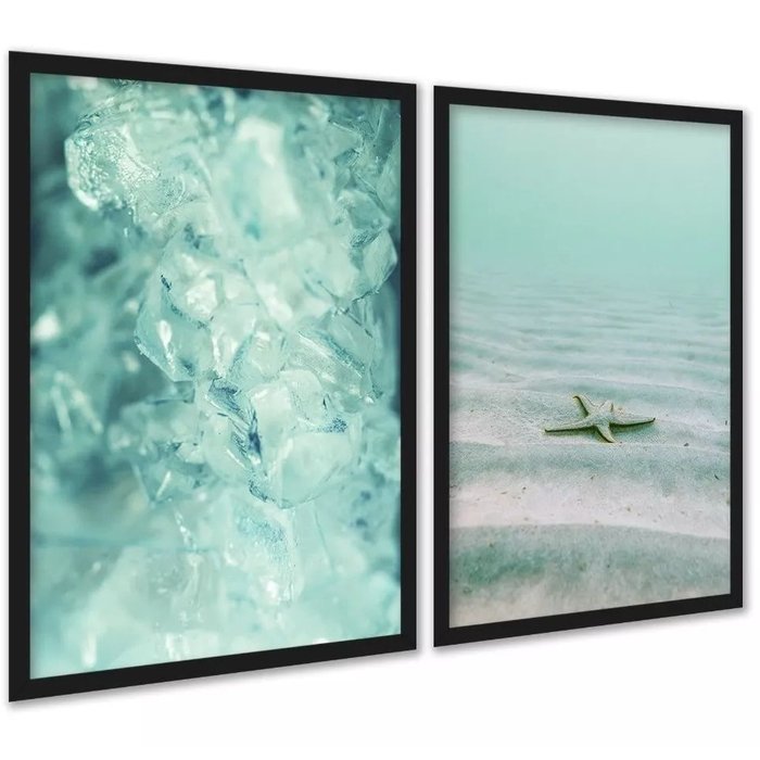 Kit 2 Quadros Verde Água Cristal Estrela do Mar 45x34cm:moldura Preta Moldura preta