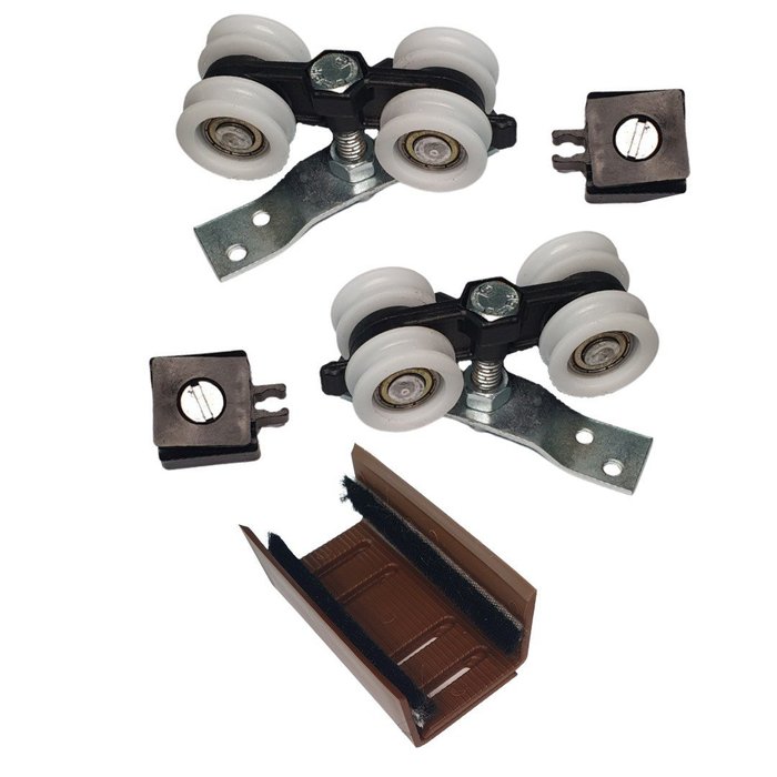 Este kit com 2 roldanas e 1 guia serve para que você instale duas portas no mesmo trilho. Estas roldanas servem especificadamente no trilho modelo alumínio 35x35 da Al-Fer, em outros modelos e marcas não servem.