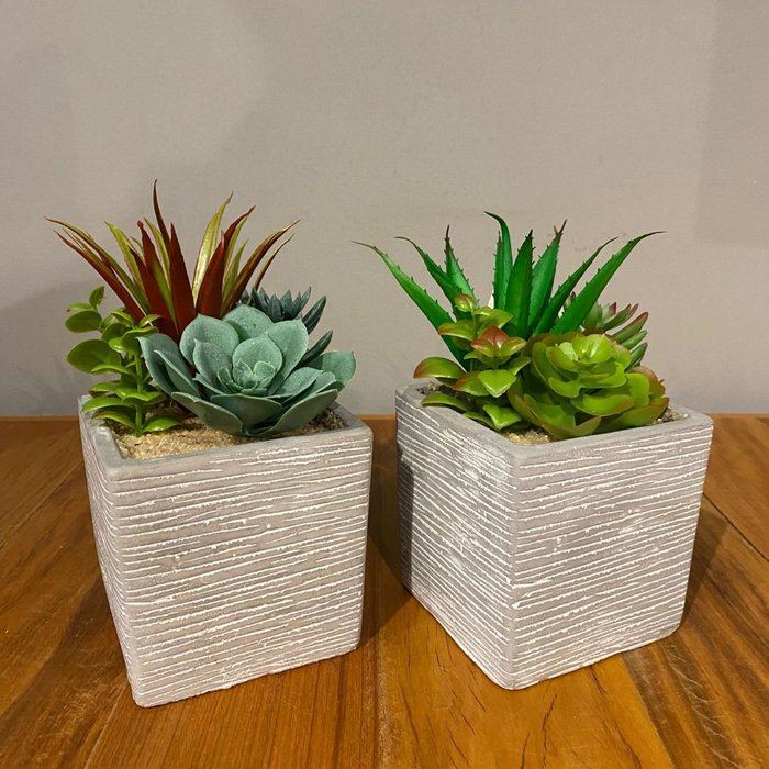 Kit 2 Suculentas Artificiais + Vasos Arranjos Vasinhos Cimento