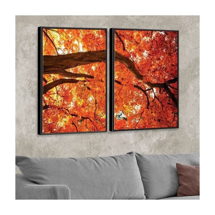 Kit 2 Telas Canvas com Moldura Arvore Folhas Laranja Preto - Médio