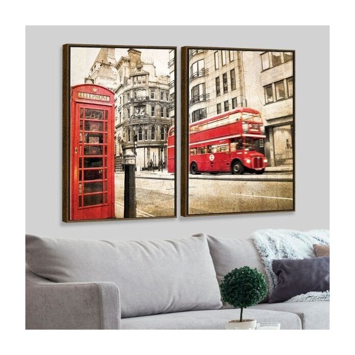 Kit 2 Telas Canvas com Moldura Londres Telefone Madeira - Grande -