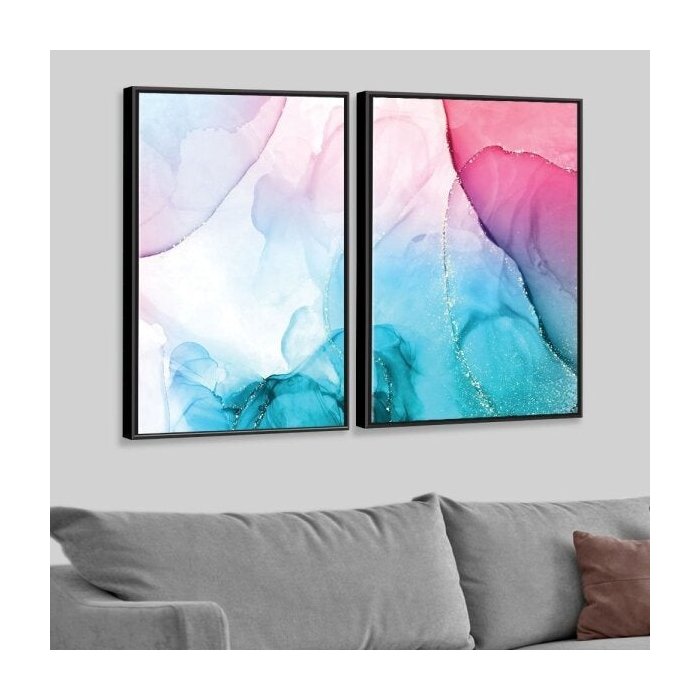 Kit 2 Telas Canvas com Moldura Textura Abstrata em Mármore Rosa e Azul Preto - Médio -