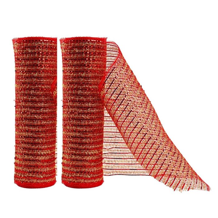 Kit 2 Telas Decorativa Fita Natal Malha Tule Listras Vermelho e Dourado 26cm X 5 Metros – Magizi Vermelho e Dourado