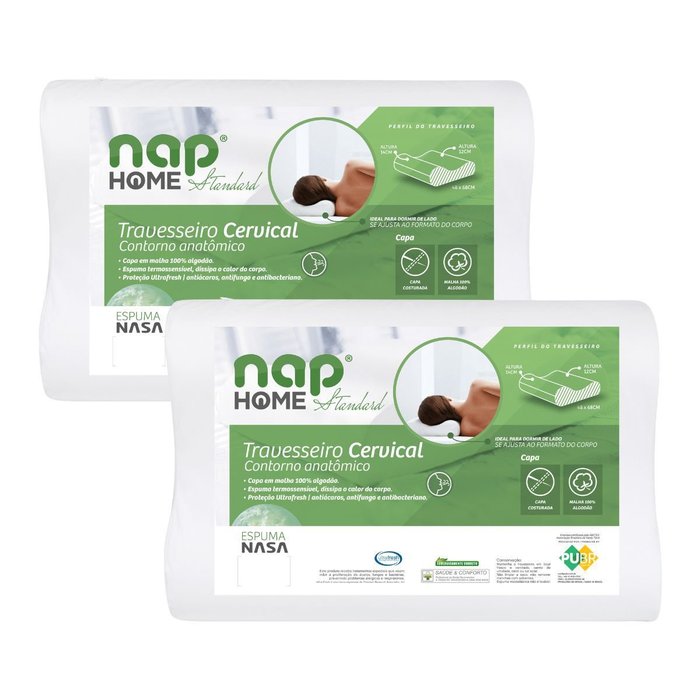 A solução para dores no pescoço, principalmente após uma noite de sono mal dormida, pode ser o seu travesseiro. O travesseiro Nasa Ortopédico Cervical foi desenvolvido em seu formato ergonômico para auxiliar na postura correta na hora de dormir! Graças as duas ondas de suporte, elas proporcionam o alinhamento do pescoço, tornando seu sono tranquilo e relaxante, auxiliando na prevenção de dores no pescoço. Na onda mais alta ele proporciona suporte ideal entre o ombro e o pescoço para quem deita de lado, já na onda mais baixa, proporciona conforto e apoio para a nuca na cervical afim de acomodar melhor quem deita de barriga para cima. Com isso, esse travesseiro é facilmente adaptado para estas formas de deitar. Por ser fabricado em material viscoelástico densidade D30, ele se acomoda aos formatos da cabeça, ombro e pescoço com suporte, unindo o formato ortopédico cervical e a tecnologia da espuma desenvolvida pela Nasa. O seu enchimento possui ainda tratamento Ultrafresh que age eliminando a presença de ácaros, fungos e bactérias. Sua espuma é termo sensível, capaz de dissipar o calor, trazendo maior sensação de frescor para o seu sono. Sua capa é feita em tecido 100% algodão em malha que evidencia o conforto deste travesseiro. Durma melhor, com saúde e bem estar de um sono tranquilo com o Travesseiro Nasa Ortopédico Cervical da NAP. Nesta embalagem contém 02 travesseiros.