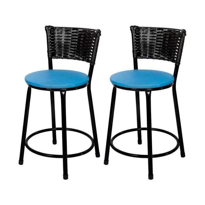 Kit 2 Unidades Banquetas Baixa Ratan Hawai Preto - Assento Azul Preto
