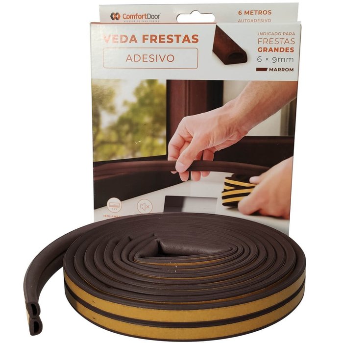 Pequenos cuidados com seu lar fazem toda a diferença. #Menor Perda do Ar Condicionado #Impede a Passagem de Sujeita #Com Proteção Acústica Garantia: 90 dias / Peso: 180g / Cor: Marrom / REF: VEDAMARROMX2 Cuidados: Cada fresta possui medidas e formatos, não molhar antes de aplicar. Veda Frestas Pequenas / Ref: 7898954594125X2 Medidas: 6m (C) x 9mm (L) x 2mm (A) Veda Frestas Médias / Ref: 7898954594569X2 Medidas: 6m (C) x 9mm (L) x 4mm (A) Veda Frestas Grandes / Ref: 7898954594088X2 Medidas: 6m (C) x 9mm (L) x 6mm (A) Veda Formato E / Ref: 7898954594064X2 Medidas: 6m (C) x 9mm (L) x 4mm (A) Material: - EPDM Adesivo. Estes vedas tem forma de borracha autoadesiva. Foram projetados para realizar a vedação de todas as frestas de portas, janelas, esquadrias, armários e etc, com mais rapidez e praticidade. Perfeito para todos os tipos de aplicação, podendo ser instalado por qualquer pessoa. Além de serem super fáceis de serem instalados, eles proporcionam proteção acústica e protegem o ambiente contra a entrada de vento, poeira, insetos, umidade, água e até mesmo auxilia na proteção contra maresia. Possui cola dupla face em sua superfície. Esta cola é de excelente qualidade e o epdm também, acompanhando a porta enquanto fechada, e retornando ao formato original quando a porta ou janela são abertas. Deixe sua casa mais protegida e seu ambiente mais climatizado evitando a entrada de insetos e a perda do ar condicionado. Instalação: 1. Retire o Veda Frestas de sua embalagem; 2. Limpe toda a superfície onde será aplicada o veda frestas, verifique se está completamente limpa e seca; 3. Destaque o rolo em duas partes; 4. Meça toda a superfície com o auxílio de uma trena e corte o veda frestas de acordo com as medidas obtidas; 5. Remova a proteção do adesivo e aplique o veda Frestas na superfície desejada.
