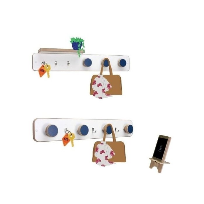 2 Unidades de Cabideiro e Suporte para Celular Decore a entrada da sua casa com esses modernos e funcionais Cabideiros de Parede com ganchos de metal para chaves e os maiores para bolsas e casacos são de MDF cortado em formato arredondado. Cabideiro de Parede para Entrada de casa ou qualquer outro ambiente, para disposição de Bolsas, casacos, chaves, bonés, etc. Material: MDF 15mm texturizado branco / preto, revestido com laminado melamínico. Bordas cruas e arredondadas. Dimensões: 53cm comprimento 10cm largura Instalação: Acompanha buchas e parafusos para fixação. Seguir atentamente o folheto explicativo. Limpeza: Sabão de coco com pano úmido a seco. Não usar água direto no móvel. Garantia contempla defeitos de fabricação. Produto direto da Fábrica.