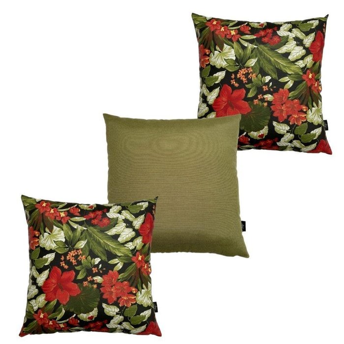 Kit 3 Almofadas Flor Hibisco Vermelha Verde Oliva 45Cmx45Cm Verde