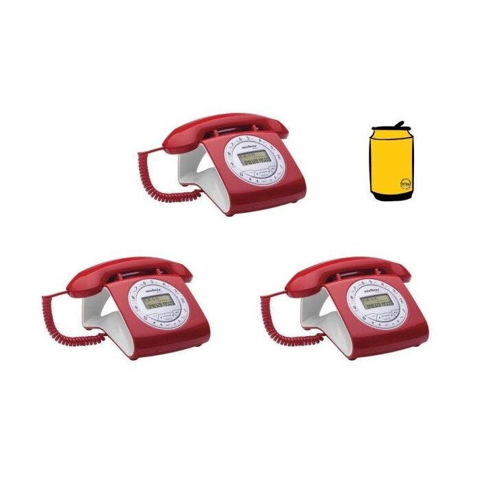 Conteudo da do Kit: 3 Unidades Telefone com Fio TC 8312 Intelbras ( 3 Telefone, 3 monofone, 3 cordão espiral, 3 cordão liso e um manual ) 1 Unidade: Bebida energética para apresentação do Produto. Cor: Vermelho Com design moderno, o TC 8312 é ideal para quem deseja compor ambientes com qualidade e sofisticação. Além do visual inovador, ele possui recursos intuitivos, como identificação de chamadas, ajuste do volume da campainha e viva-voz. O TC 8312, o Telefone que vai dar o que falar. Identificação de Chamada: Sim Sinalização: DTMF / FSK Display luminoso: Não Data e Hora: Sim Agenda: Não Memória para registro de chamadas: Registro de 66 chamadas recebidas (atendidas e não atendidas) e 20 originadas. Viva - Voz: Sim (04 níveis de ajuste do volume de recepção) Indicador de Chamadas Não Atendidas: Sim (NOVO) no Display Toques de campainha: 16 tipos de timbres programáveis Volume da campainha: 3 níveis de volume da campainha (alto, baixo e mudo) Garantia: 12 meses Dimensões aproximadas do Produto - cm (AxLxC)]: 180 x 130 x 120 mm Peso liq. Aproximado do Produto (Kg): 796 g Maiores Informações: Design diferenciado Ajuste de contraste do display (8 níveis) Flash ajustável (100, 300, 600 ou 1000 ms) Função Rediscagem »Tecla Hold (6 tipos de melodia) Discagem por tom ou pulso (ajustável) Viva-voz com ajuste de volume