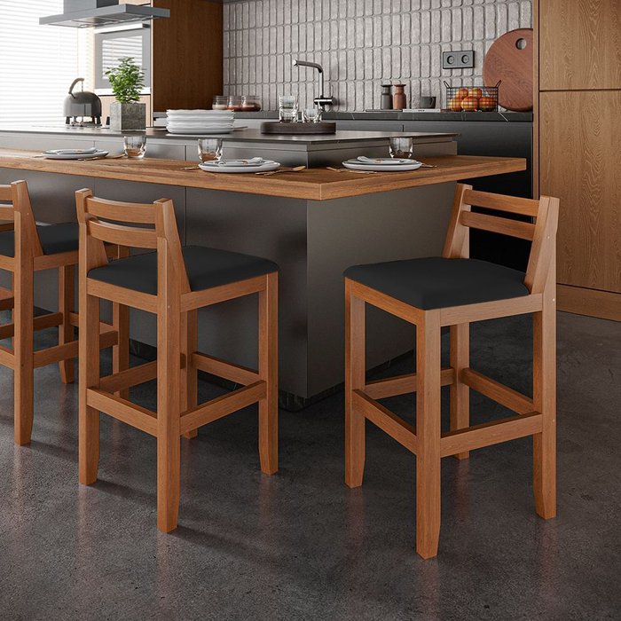 Kit 3 Banquetas em Madeira Maciça Ibiza 78 Cm - Malbec Assento Preto PRETO