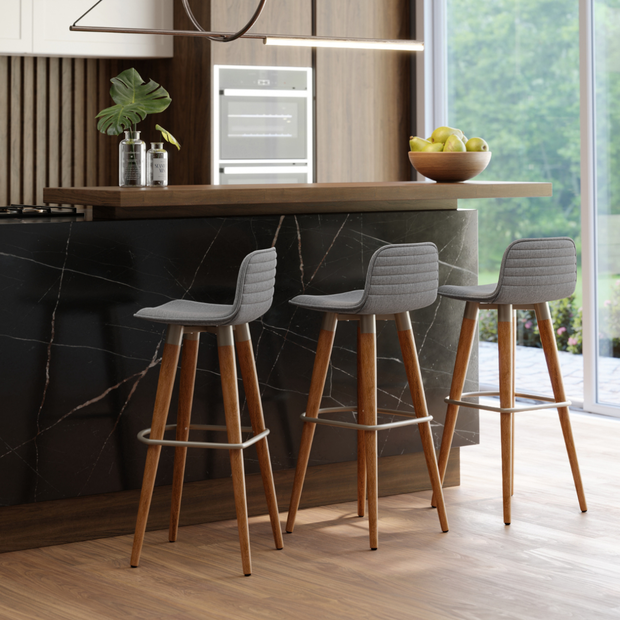 Design moderno, conforto e resistência para bancada, cozinha ou espaço gourmet. Assentos em linho e base em madeira maciça carvalho: elegantes, firmes e fáceis de montar.