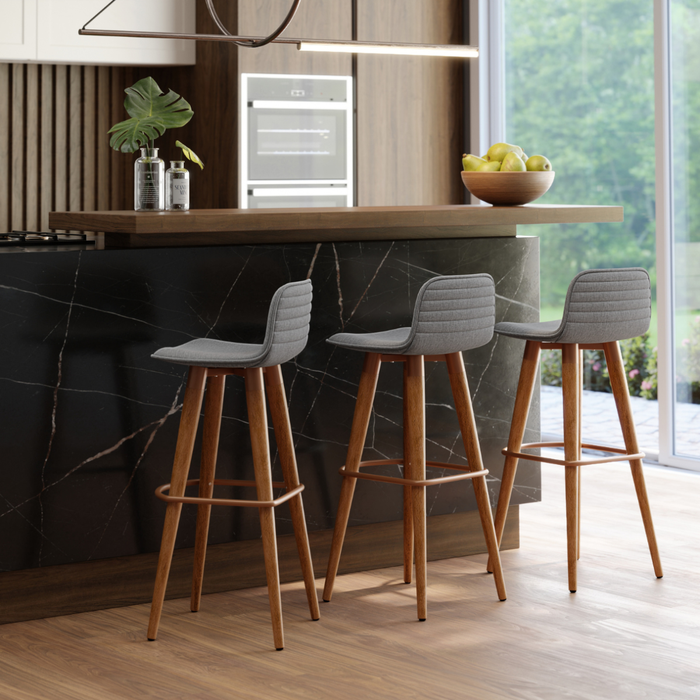 Design moderno, conforto e resistência para bancada, cozinha ou espaço gourmet. Assentos em linho e base em madeira maciça carvalho: elegantes, firmes e fáceis de montar.