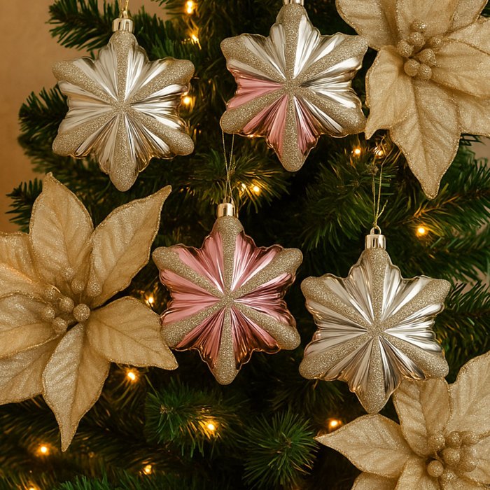 Confeccionadas em plástico leve com um acabamento em glitter, as estrelas possuem um design moderno e sofisticado. O trio é composto por uma estrela na cor rosé e duas na cor prata, criando um conjunto harmonioso e charmoso. Com a leveza do material, elas podem ser penduradas facilmente em qualquer galho da árvore, garantindo um visual luminoso e festivo.