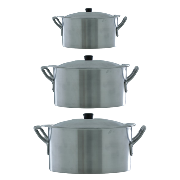 Kit com 3 caçarolas de alumínio da linha hotel/restaurante, tamanhos 28, 32 e 36. Ideais para cozinhas profissionais, duráveis e com alta eficiência térmica. Perfeitas para preparar grandes quantidades de alimentos com qualidade.