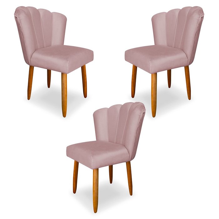 Kit 3 Cadeiras de Jantar Pétala Estofada Pés Palito Veludo Rosê Claro - Montanaris Decor