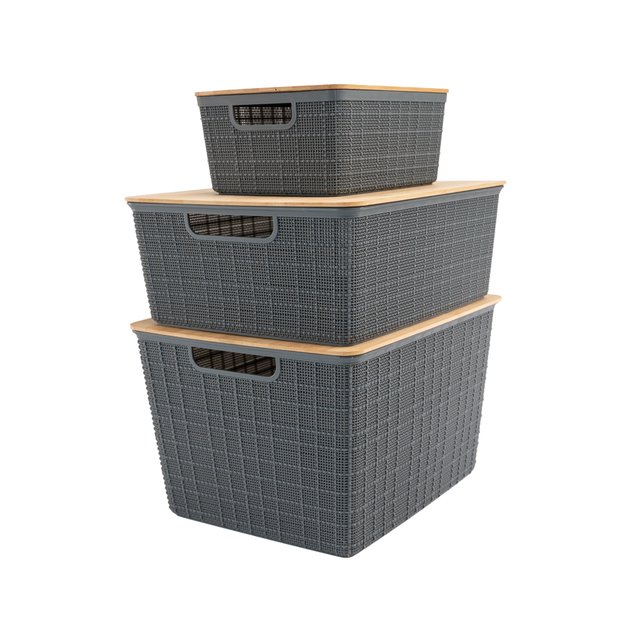 KIT02671 - Kit 3 Caixas Organizadoras Cinza C/ Tampa Bambu - P, M e G