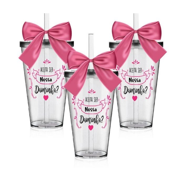 Kit 3 Copos Convite com Laço Personalizado Daminha Acrílico