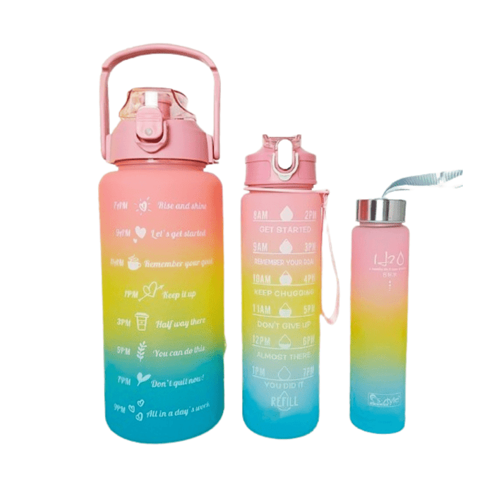 Kit 3 Garrafas Alça Agua Canudo Adesivo Academia Motivacional Squeeze Rose/Amarela/Azul