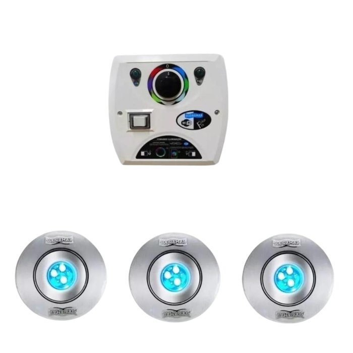 KIT CONTENDO:3 Refletor Hiper Led 9w Rgb Abs / Inox P/ Até 14m² PARA CANO DE 50MM- Sodramar+1 Comando Four Fix 81W C/ Wifi Para Led De Piscina - Sodramar- Refletor Hiper Led 9w Rgb Abs / Inox P/ Até 14m² PARA CANO DE 50MM- SodramarPara aqueles que procuram sofisticação e design, o equipamento ideal é o Hiper Led. Com corpo em ABS, acabamento frontal em INOX e suas dimensões menores em relação aos outros refletores do mercado, é uma peça única e ideal para quem procura um produto discreto e exclusivo. Além de todas as qualidades estéticas do produto ele ilumina até 14 m².Atenção: Verificar qual o tamanho da tubulação onde a luminária será encaixada (tubo de 50 mm ou 25 mm)***REFLETOR PARA CANO DE 50MM **- DRIVER COMANDO FOUR FIX P/ LED C/ WI-FI 81W COM TRANSFORMADOR E RETIFICADOR - SODRAMAR PISCINASAgora a iluminação da piscina pode ser controlada através do seu celular!O Driver Four Fix com comando WiFi tem a função de controlar a iluminação por Led da piscina. Este controle poderá ser manual ou via WiFi por intermédio de tablete ou celular. O módulo de comando Four Fix Sodramar conta com a acessibilidade do Wi-Fi, que permite que o usuário conecte seu celular ao módulo através do sinal Wi-Fi que o equipamento emite. Nele você tem as opções de trocar as cores da iluminação da piscina, escolher entre uma das várias programações pré-definidas ou escolher a função musical, onde os LEDs acompanham e piscam de acordo com uma música ambiente ou música que esteja tocando no seu celular. Também é possível selecionar a cor do LED utilizando a câmera do celular, apontando para uma cor que deseja atingir a tonalidade. Tudo isso é possível através de um aplicativo (MAGIC HOME) que pode ser baixado em celulares com sistema Android e IOS. Com potência de 81 Watts, o comando já vem com transformador e seletor de cores manual, com a opção de escolha de 7 cores pré-definidas.
