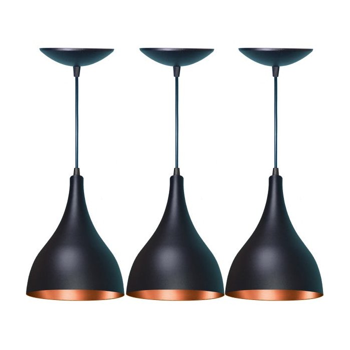 Kit 3 Luminárias Pendente Gota em Alumínio Preta Fosca/Cobre