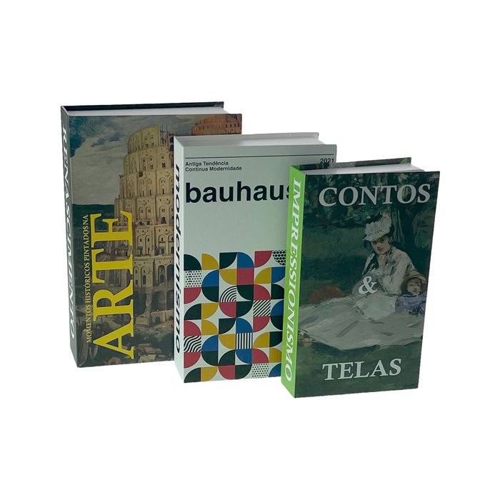 Composto por 3 livros fakes em tamanhos diferentes, fabricados em papel reforçado e resistente, sendo bem firmes.