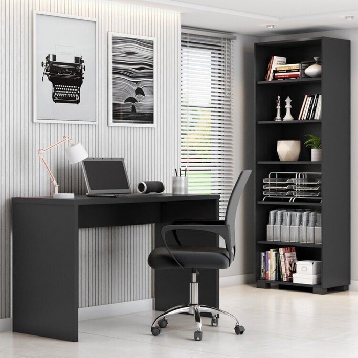 Kit 3 Peças com Cadeira para Escritório, Estante Livreiro e Escrivaninha Gávea Espresso Móveis Preto