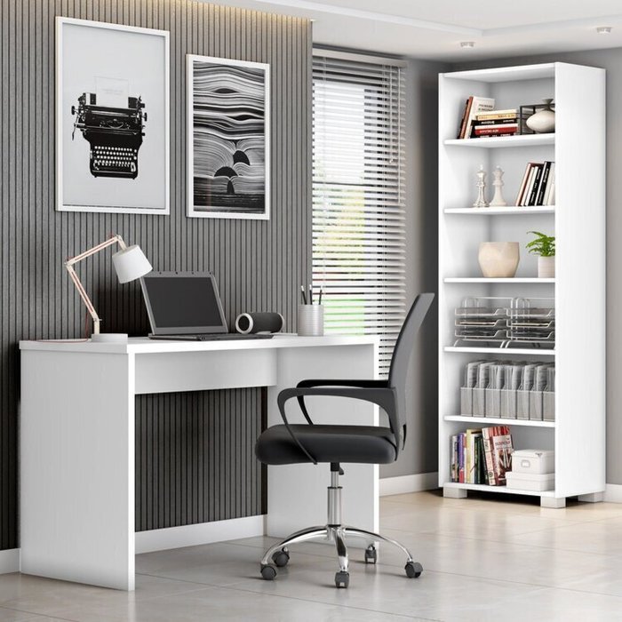 Kit 3 Peças com Cadeira para Escritório, Estante Livreiro e Escrivaninha Gávea Espresso Móveis Branco