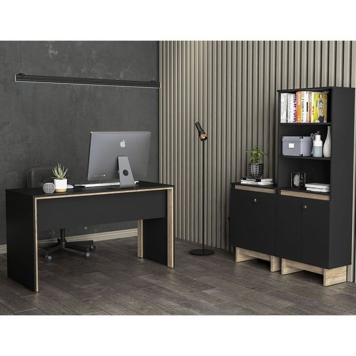 Kit 3 Peças com Mesa para Escritório 135cm, Armário Baixo e Estante Los Angeles Preto/Carvalho Claro