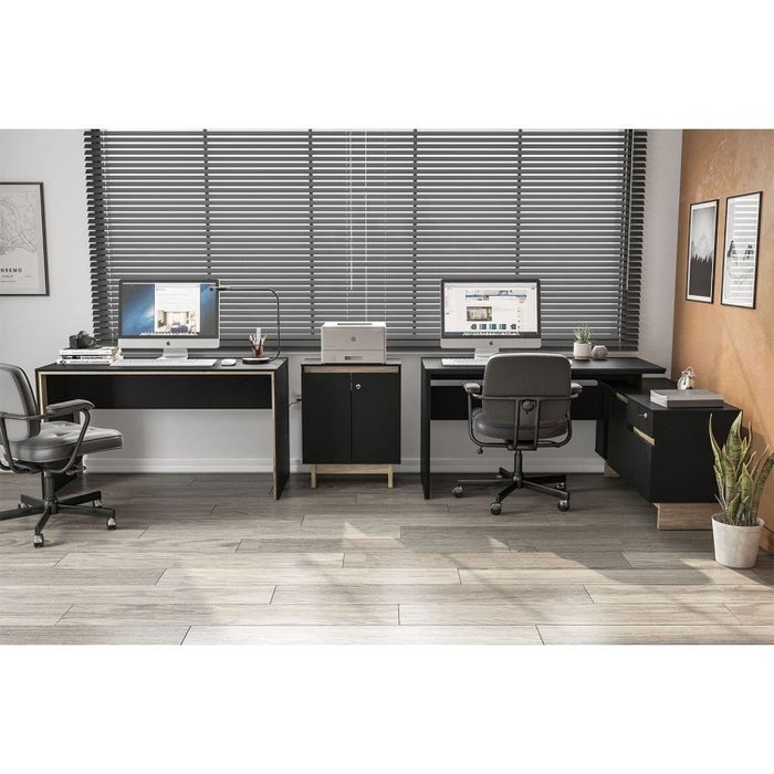 Kit 3 Peças com Mesa para Escritório em L, Mesa Reta e Armário Baixo Los Angeles Preto/Carvalho Claro