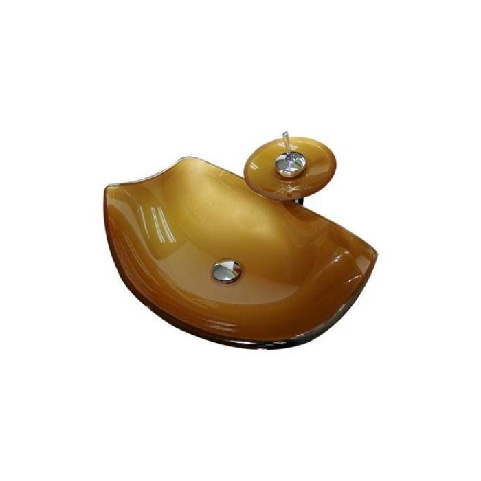 Dimensões: 42,5 x 28,5 x 10,5cm espessura: 12mm material: vidro temperado. kit 3 peças com cuba de vidro da cor dourada abaulada oval (canoa), válvula click cromada para lavatórios e torneira cascata de vidro temperado da cor dourada