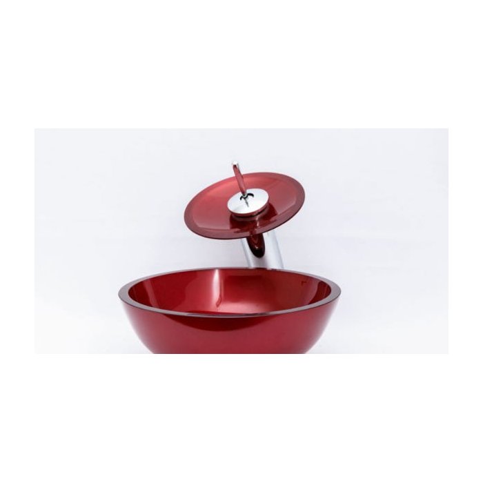 Dimensões: 31,5 x 10,6cm espessura: 12mm material: vidro temperado. kit 3 peças com cuba de vidro na cor vermelha, forma aredondada, válvula click cromada para lavatórios e torneira cascata de vidro temperado na cor vermelha