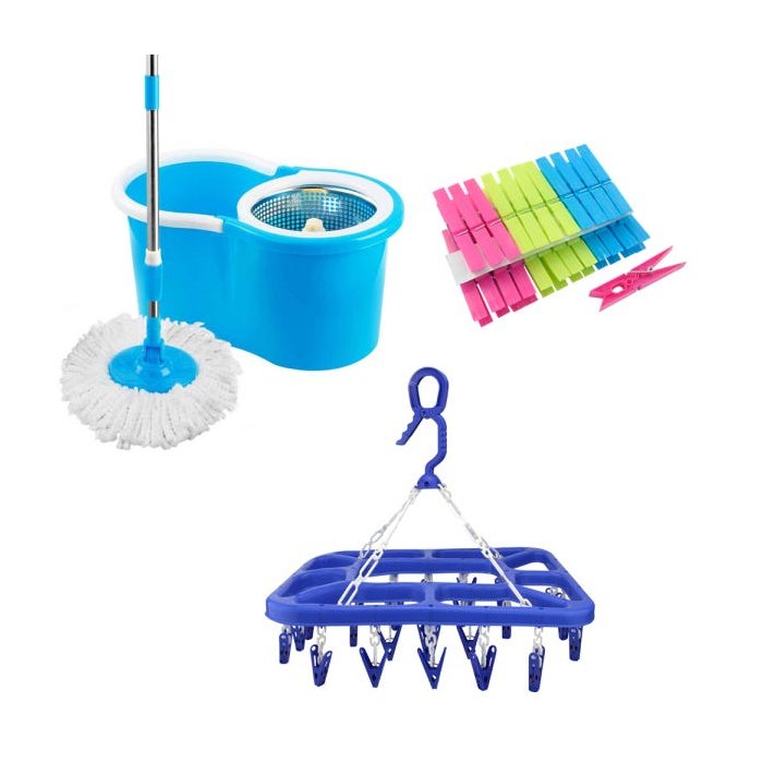 Kit 3 Peças Esfregão Mop Azul + Mini Varal Roupa Intima + Prendedores
