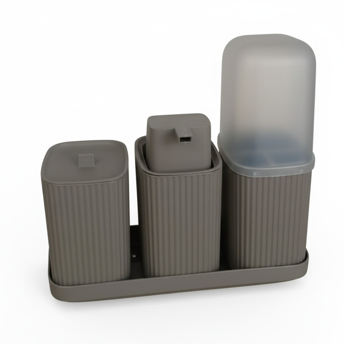 Ficha Técnica:Produto: Kit Trio para banheiro com bandejaModelo: Usual Utilidades CaneladoMarca: Usual UtilidadesInstalação ou tipo de uso: Uso direto em lavabos e banheirosMaterial: Polipropileno resistenteDimensões e medidas relevantes: Porta escovas 21 × 7,5 cm | Porta algodão 13 × 7,5 cm | Dispenser 14 × 7,5 cm (capacidade 400 ml) | Bandeja 23 × 8 cmAcabamento e cores: Preto ou Cinza escuroAplicação e indicação de uso: Organização de escovas, algodão, sabonete líquido e higiene do banheiro/lavaboItens Inclusos: 1 Porta escovas | 1 Dispenser 400 ml para sabonete líquido | 1 Porta algodão com tampa | 1 Bandeja organizadoraPeso com embalagem: 0,800 kgDimensões com embalagem: Largura: 25 cm | Altura: 23 cm | Profundidade: 9 cm