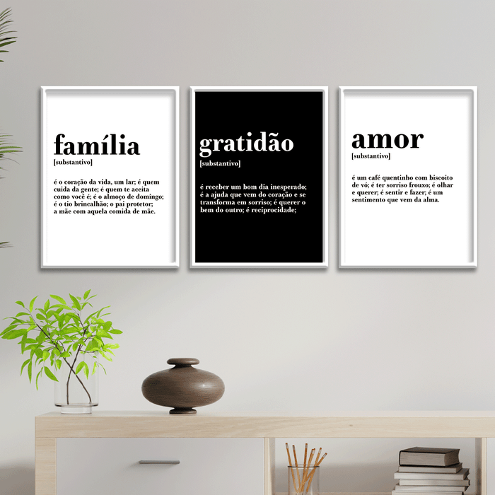 Kit 3 Plaquinhas Decorativa Adesivada Família, Gratidão, Amor Branco - 20x30cm