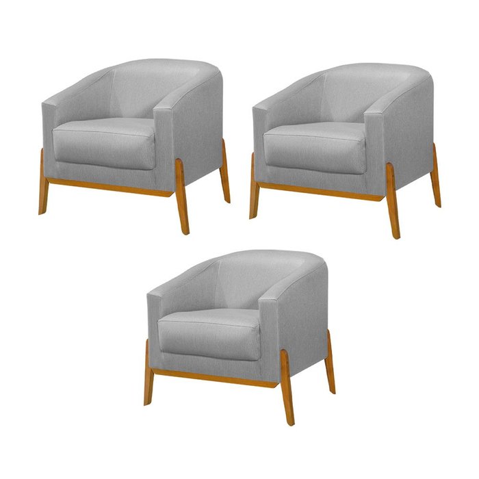 Kit 3 Poltronas Living Base em Madeira Maciça Flórida Linho Cinza