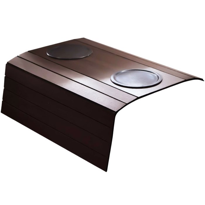 Esteira flexível para braço de sofá com 2 suportes para copos, útil para apoiar copos, controles, notebooks, pode ser também usado como jogo americano para apoiar pratos. Desenvolvido em madeira resistente em um design prático e moderno.